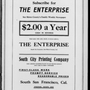 Local South San Francicsco newspaper documenting the town's growth as an industrial center between 1895 and 1925. Source material provided by the California Newspaper Microfilm Archive.
