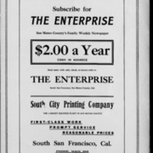 Local South San Francicsco newspaper documenting the town's growth as an industrial center between 1895 and 1925. Source material provided by the California Newspaper Microfilm Archive.