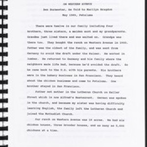 Family farm history Topics covered include: Chicken husbandry; Immigrant family history; Petaluma chicken ranch.