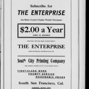 Local South San Francicsco newspaper documenting the town's growth as an industrial center between 1895 and 1925. Source material provided by the California Newspaper Microfilm Archive.