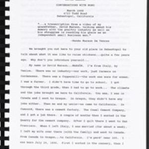 Immigration from Italy to Canada, Oregon, California, Immigration for economic reasons. Topics covered include: Chicken ranching on rented ranch; First immigrant jobs; Great Depression era; Immigrant farming; Ranch life.
