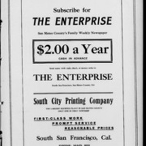 Local South San Francicsco newspaper documenting the town's growth as an industrial center between 1895 and 1925. Source material provided by the California Newspaper Microfilm Archive.