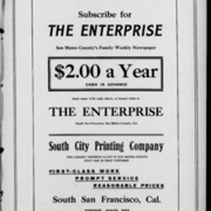 Local South San Francicsco newspaper documenting the town's growth as an industrial center between 1895 and 1925. Source material provided by the California Newspaper Microfilm Archive.