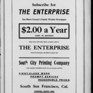 Local South San Francicsco newspaper documenting the town's growth as an industrial center between 1895 and 1925. Source material provided by the California Newspaper Microfilm Archive.