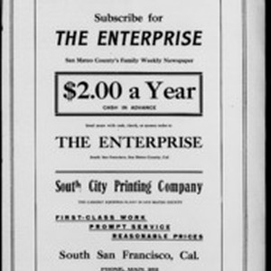 Local South San Francicsco newspaper documenting the town's growth as an industrial center between 1895 and 1925. Source material provided by the California Newspaper Microfilm Archive.