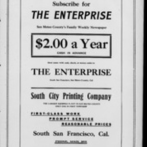 Local South San Francicsco newspaper documenting the town's growth as an industrial center between 1895 and 1925. Source material provided by the California Newspaper Microfilm Archive.