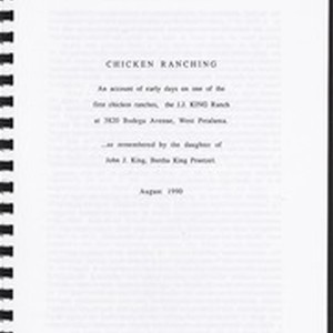 The J. J. King Ranch at 3820 Bodega Avenue, West Petaluma; as remembered by the daughter of John J. King, Bertha King Praetzel. Topics covered include: Chicken diseases; Chicken houses; Chicken's diet; Early Petaluma chicken ranches; Egg laying contest; Poultry vegetarian diet; Ranch childhood.