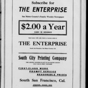 Local South San Francicsco newspaper documenting the town's growth as an industrial center between 1895 and 1925. Source material provided by the California Newspaper Microfilm Archive.