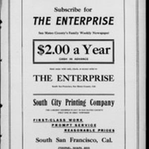 Local South San Francicsco newspaper documenting the town's growth as an industrial center between 1895 and 1925. Source material provided by the California Newspaper Microfilm Archive.