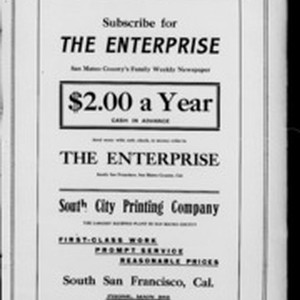Local South San Francicsco newspaper documenting the town's growth as an industrial center between 1895 and 1925. Source material provided by the California Newspaper Microfilm Archive.