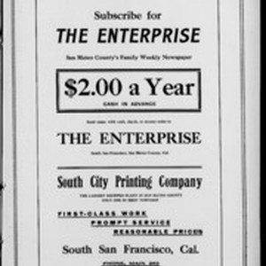 Local South San Francicsco newspaper documenting the town's growth as an industrial center between 1895 and 1925. Source material provided by the California Newspaper Microfilm Archive.
