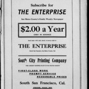 Local South San Francicsco newspaper documenting the town's growth as an industrial center between 1895 and 1925. Source material provided by the California Newspaper Microfilm Archive.