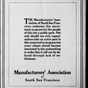 Copyright status unknown. This work may be protected by the U.S. Copyright Law (Title 17, U.S.C.). In addition, its reproduction may be restricted by terms of gift or purchase agreements, donor restrictions, privacy and publicity rights, licensing and trademarks. This work is accessible for purposes of education and research. Transmission or reproduction of works protected by copyright beyond that allowed by fair use requires the written permission of the copyright owners. Works not in the public domain cannot be commercially exploited without permission of the copyright owner. Responsibility for any use rests exclusively with the user. South San Francisco Public Library attempted to find rights owners without success but is eager to hear from them so that we may obtain permission, if needed. Upon request to ssfhistorical@gmail.com, digitized works can be removed from public view if there are rights issues that need to be resolved.