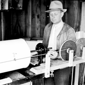 LaFond designed the wave recorder and Carl Irvin Johnson built it. The sea unit consisted of a metal cylindrical float which moved vertically, guided by two taught wires extending from a heavy weight on the seafloor to the winch shown in the extreme lower right corner. One white line shown in the lower right is attached to the float. The line rests on a wooden wheel and the other end of the line has a counter weight. As the float moves up and down with the ocean swell, the white line turns the wooden wheel. A second wooden wheel acts as a reduction gear and is connected by a line and bar which drives the stylus right and left across the paper as the motor driven drum burns, thus giving a time/height record of the swell. The drum and its gears are from an old seismograph provided by a seismologist in Pasadena. The wave recorder was operated eight minutes each day in 1937-1938 proving swell height and period. Special Collections & Archives, UC San Diego, La Jolla, 92093-0175 (https://lib.ucsd.edu/sca) This digital image is a surrogate of an item from the Eugene Cecil LaFond Photographs, 1930-1940 This is a direct duplicate neg made in 1993 by Loren Pigniolo from the 35mm nitrate originals