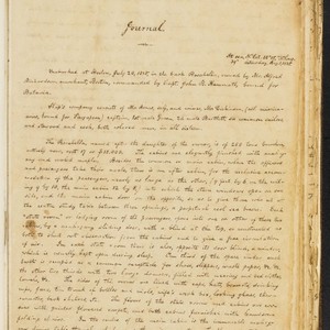 Special Collections & Archives, UC San Diego, La Jolla, 92093-0175 (https://lib.ucsd.edu/sca) These digital images are surrogates of items from the Alfred North Correspondence and Other Documents (Box 1, Folder 3). North's journal documents the voyage from Boston to the American Board mission at Singapore with his wife, Minerva. The 171-day voyage took them from the eastern seaboard to Trinidad, down the coast of South America, across the Atlantic to Africa, around the Cape of Good Hope, across the Indian Ocean to Batavia, Java, and finally (on a different ship) onto Singapore. The diary records North's detailed observations of daily life on board the ship and the various ports of call. Journal leaves were numbered in pencil on the upper corners at an unknown date; there are some gaps in the numbering, which indicates a few missing page sequences. [Title, Date]. Alfred North Correspondence and Other Documents. MSS 138. Special Collections & Archives, UC San Diego.
