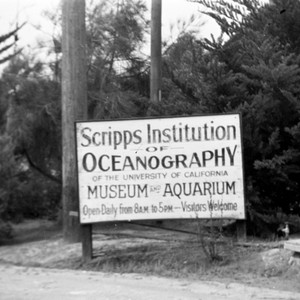 "Scripps Institution of Oceanography of the University of California. Museum and Aquarium Open Daily from 8 A.M. to 5 P.M. Visitors Welcome" Special Collections & Archives, UC San Diego, La Jolla, 92093-0175 (https://lib.ucsd.edu/sca) This digital image is a surrogate of an item from the Eugene Cecil LaFond Photographs, 1930-1940 This is a direct duplicate neg made in 1993 by Loren Pigniolo from the 35mm nitrate originals