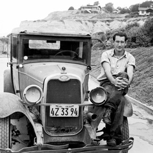 Kenneth Orris Emery sitting on car on the Scripps Institution of Oceanography campus. He was a guest at the Institution for two years while pursuing his doctoral research on the California continental margins. Special Collections & Archives, UC San Diego, La Jolla, 92093-0175 (https://lib.ucsd.edu/sca) This digital image is a surrogate of an item from the Eugene Cecil LaFond Photographs, 1930-1940 This is a direct duplicate neg made in 1993 by Loren Pigniolo from the 35mm nitrate originals