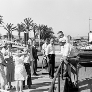 Among the group waiting to board is Ellen Virginia Clark Revelle (second from the left), wife to Scripps Institution of Oceanography oceanographer Roger Revelle. Also pictured is Erik Gustaf Moberg (third from right), another oceanographer at Scripps Institution of Oceanography. Special Collections & Archives, UC San Diego, La Jolla, 92093-0175 (https://lib.ucsd.edu/sca) This digital image is a surrogate of an item from the Eugene Cecil LaFond Photographs, 1930-1940 This is a direct duplicate neg made in 1993 by Loren Pigniolo from the 35mm nitrate originals