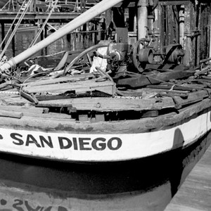 R/V Scripps exploded and burned on November 13, 1936 at the San Diego Yacht Basin. Salvage efforts were undertaken November 14-16, 1936. Special Collections & Archives, UC San Diego, La Jolla, 92093-0175 (https://lib.ucsd.edu/sca) This digital image is a surrogate of an item from the Eugene Cecil LaFond Photographs, 1930-1940 This is a direct duplicate neg made in 1993 by Loren Pigniolo from the 35mm nitrate originals