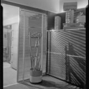Access to this collection is generously supported by Arcadia funds. Detail view of art deco cabinet with wood paneling and aluminum strips in The Bachelors haberdashery, designed by Julius Ralph Davidson. Men's brief cases and satchels are on top of the cabinet and a cactus (?) in a pot stands next to the cabinet, in front of venetian blinds functioning as a room divider. The carpeting is composed of brown and tan strips. Text from negative sleeve: Jock Peters - Bachelors - Rewelling