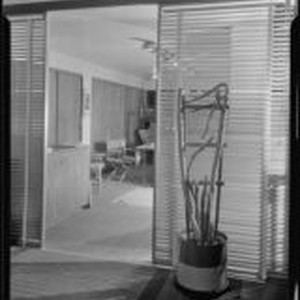 Access to this collection is generously supported by Arcadia funds. Detail of the art deco styled interior of The Bachelors haberdashery, designed by Julius Ralph Davidson in an art deco style. A cactus in a pot stands in front of venetian blinds serving as a room divider. The room beyond is furnished with directors chairs and a wood paneled desk, and the wall on the left is faced with closets with wood paneled sliding doors. Text from negative sleeve: Jock Peters - Bachelors - Rewelling