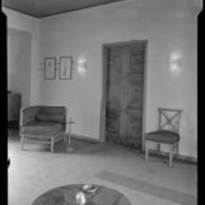 Access to this collection is generously supported by Arcadia funds. Interior view of "Irene LTD," a dress shop of designer Irene Lentz Gibbons, with art deco stye furnishings including an upholstered chair, an x-back chair with an upholstered seat, a wood paneled cabinet, a wood paneled round table, the walls decorated with two framed fashion illustrations and two sconces. There is an elaborate paneled wooden door and the floor is covered in carpet with a design formed by thin rectangles. Text from negative sleeve: Jock Peters - Bachelors - Rewelling [caption does not appear to relate to the Irene LTD images; The Bachelor haberdashery is attributed to Julius Ralph Davidson]