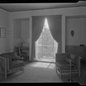 Access to this collection is generously supported by Arcadia funds. Interior view of "Irene LTD," a dress shop of designer Irene Lentz Gibbons, with art deco style furnishings including two upholstered chairs, a wood paneled niche desk with an x-back chair (left), a wood paneled cabinet (right), the walls decorated with a framed fashion illustration and a wood relief sculpture of a woman's head. Curtained French doors open to a narrow balcony. Text from negative sleeve: Jock Peers - Bachelors - Rewelling [caption does not appear to relate to the Irene LTD images; The Bachelor haberdashery is attributed to Julius Ralph Davidson]