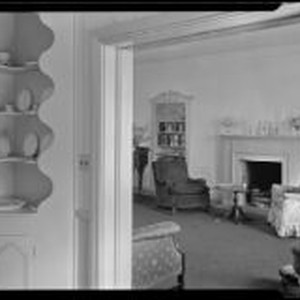 Access to this collection is generously supported by Arcadia funds. Although the negative sleeve attributes this work in this image to Jock Peters, other images in this negative group represent the Bachelors haberdashery by J. R. Davidson. View from the dining room, with a built-in china cupboard with undulating wood forming the sides and shelf ends (left), into the living room of a house furnished with upholstered chair and a small table arranged in front of the fireplace, a built-in bookcase, a partially visible piano and 2 additional upholstered chairs. Possibly designed by Jacob (Jock) Detlof Peters or J. R. Davidson. Text from negative sleeve: Jock Peters, Bachelors, Rewelling