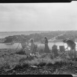 Access to this collection is generously supported by Arcadia funds. View of Barse Miller (right) engaged in plein-ari painting, selecting paint from a lidded box on a table, on high ground overlooking a shoreline waterway. Two women are painting at easels.