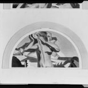 Access to this collection is generously supported by Arcadia funds. Lunette-shaped mural study with a nude half-figure female personification of a river, with water flowing from an amphora that she holds on her shoulder, with a road and buildings in the background.