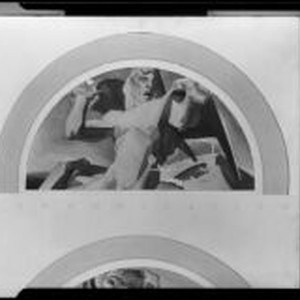 Access to this collection is generously supported by Arcadia funds. Lunette-shaped mural study with a male nude half-figure with his hands raised upwards and small airplanes flying around him. A caption beneath the image reads: Communication.