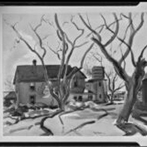 Access to this collection is generously supported by Arcadia funds. Watercolor painting of a farm scene with a 2-story farm house, a silo (?) and other buildings