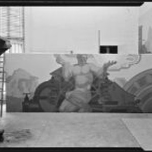Access to this collection is generously supported by Arcadia funds. Studio view of a painting of a kneeling nude man with uplifted hands in front of a building and truss work, perhaps a study for a mural