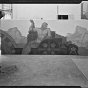 Access to this collection is generously supported by Arcadia funds. Studio view of a painting of a nude man seated on mechanistic apparatus with mountains in the background, perhaps a study for a mural