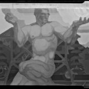 Access to this collection is generously supported by Arcadia funds. Painting of a kneeling nude man with uplifted hands in front of a building and truss work, perhaps a study for a mural