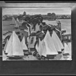 Access to this collection is generously supported by Arcadia funds. Painting of an off shore island (?) with houses and sailboats. Signed: Barse Miller