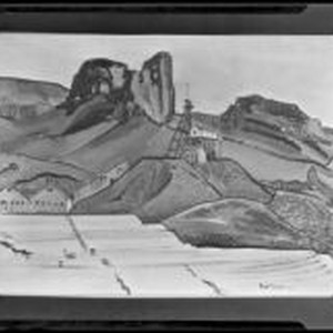 Access to this collection is generously supported by Arcadia funds. Watercolor painting with a vacant foreground and farming or industrial activity indicated by buildings, a truss tower and a building that appears to be on stilts in the lower hills beyond Signed: Barse Miller