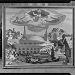 Access to this collection is generously supported by Arcadia funds. “Apparition over Los Angeles,” (1932) presents Sister Aimee McPherson, founder of the Four-Square Church in Echo Park, Los Angeles, nude in the sky flanked by her mother, also nude, and her husband, above angels, one in a high hat presiding over money-bag shaped clouds, with the Angelus Temple in Echo Park below. The painting is in a frame.