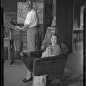 Access to this collection is generously supported by Arcadia funds. Photograph of Stanley Reckless standing in front of a painting on an easel in his studio, looking towards his wife (?) seated in a chair with a cat Stanley Reckless was born Stanley Zbytniewski. In 1913 he enrolled at the Pennsylvania Academy of the Fine Arts (PAFA), studied under Daniel Garber. In 1915, 1916 he was awarded 2 Cresson Traveling Scholarships, and traveled to Paris, enrolling briefly at the Academie Julian. In 1920 he moved to Lumberville, Pennsylvania and started exhibiting at PAFA, the National Academy of Design, and the Corcoran Gallery of Art. In 1924 he settled in New Hope, Pennsylvania, where he painted the landscape and shared a studio with Charles Hargens. In 1930 he moved to California where he painted portraits of members of the film industry. He co-founded the Art Center School in Los Angeles. Text from negative sleeve: Reckless - Asange