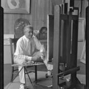 Access to this collection is generously supported by Arcadia funds. Photograph of Stanley Reckless seated in front of a painting on an easel and holding a paint brush with a Pallet on a tripod next to him. Two paintings on the wall behind him are partially visible and other paintings are turned away and leaning against the wall. Stanley Reckless was born Stanley Zbytniewski. In 1913 he enrolled at the Pennsylvania Academy of the Fine Arts (PAFA), studied under Daniel Garber. In 1915, 1916 he was awarded 2 Cresson Traveling Scholarships, and traveled to Paris, enrolling briefly at the Academie Julian. In 1920 he moved to Lumberville, Pennsylvania and started exhibiting at PAFA, the National Academy of Design, and the Corcoran Gallery of Art. In 1924 he settled in New Hope, Pennsylvania, where he painted the landscape and shared a studio with Charles Hargens. In 1930 he moved to California where he painted portraits of members of the film industry. He co-founded the Art Center School in Los Angeles. Text from negative sleeve: Reckless - Asange