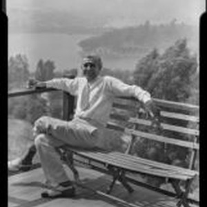 Access to this collection is generously supported by Arcadia funds. Photograph of artist Stanley Reckless seated on a bench on a balcony of his home overlooking Silver Lake. He holds a drink in one hand and a cigarette in the other. He is dressed in light colored trousers, a white shirt and light colored tie. Stanley Reckless was born Stanley Zbytniewski. In 1913 he enrolled at the Pennsylvania Academy of the Fine Arts (PAFA), studied under Daniel Garber. In 1915, 1916 he was awarded 2 Cresson Traveling Scholarships, and traveled to Paris, enrolling briefly at the Academie Julian. In 1920 he moved to Lumberville, Pennsylvania and started exhibiting at PAFA, the National Academy of Design, and the Corcoran Gallery of Art. In 1924 he settled in New Hope, Pennsylvania, where he painted the landscape and shared a studio with Charles Hargens. In 1930 he moved to California where he painted portraits of members of the film industry. He co-founded the Art Center School in Los Angeles. Text from negative sleeve: Reckless - Asange
