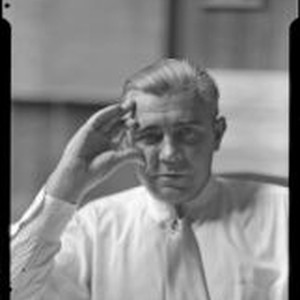 Access to this collection is generously supported by Arcadia funds. Photographic portrait of artist Stanley Reckless wearing a white shirt and tie and seated in his studio with his right hand raised to his temple. Stanley Reckless was born Stanley Zbytniewski. In 1913 he enrolled at the Pennsylvania Academy of the Fine Arts (PAFA), studied under Daniel Garber. In 1915, 1916 he was awarded 2 Cresson Traveling Scholarships, and traveled to Paris, enrolling briefly at the Academie Julian. In 1920 he moved to Lumberville, Pennsylvania and started exhibiting at PAFA, the National Academy of Design, and the Corcoran Gallery of Art. In 1924 he settled in New Hope, Pennsylvania, where he painted the landscape and shared a studio with Charles Hargens. In 1930 he moved to California where he painted portraits of members of the film industry. He co-founded the Art Center School in Los Angeles. Text from negative sleeve: Reckless - Asange