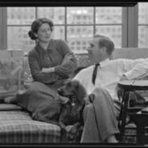 Access to this collection is generously supported by Arcadia funds. According to the Pasadena City Directory, in 1935 Paul and Sylvia Sample lived at 676 La Loma Road in Pasadena Photograph of Paul Sample and his wife Sylvia Sample is seated on a studio couch with a dog in the studio of their Pasadena home. A painting is just behind Sylvia on the left. Text from negative sleeve: Paul Sample. Artist. Portrait. incl w/wife Sylvia. Ca. 1935.