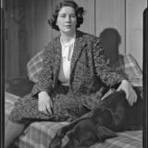 Portrait photograph of Sylvia Sample, wife of painter Paul Sample, seated on a couch in the studio of their Pasadena home.