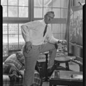 Access to this collection is generously supported by Arcadia funds. According to the Pasadena City Directory, in 1935 Paul and Sylvia Sample lived at 676 La Loma Road in Pasadena Paul Starrett Sample was an American artist who portrayed life in New England in the middle of the 20th Century with a style that showed elements of Social Realism and Regionalism. He went to Los Angeles in the 1920's to study at Otis Art Institute, and was on the faculty of the University of Southern California in the school of architecture from 1926 to 1938, when he left to assume a teaching position at Dartmouth College. Photograph of Paul Sample standing before a painting on an easel with a paint brush in each hand, in his studio in his Pasadena home. Text from negative sleeve: Paul Sample. Portrait. Artist. And wife Sylvia. Ca. 1935.
