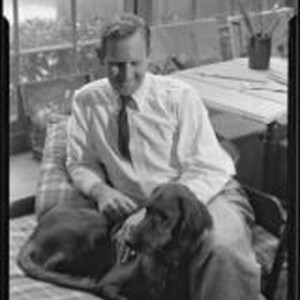 Access to this collection is generously supported by Arcadia funds. According to the Pasadena City Directory, in 1935 Paul and Sylvia Sample lived at 676 La Loma Road in Pasadena Text from negative sleeve: Paul Sample. Portrait. Artist. And wife Sylvia. Ca. 1935. Photograph of artist Paul Sample wearing a white shirt and tie, seated in his studio in his Pasadena home with his dog. A jar with paint brushes is on the table behind him. England in the middle of the 20th Century with a style that showed elements of Social Realism and Regionalism. He went to Los Angeles in the 1920's to study at Otis Art Institute, and was on the faculty of the University of Southern California in the school of architecture from 1926 to 1938, when he left to assume a teaching position at Dartmouth College.