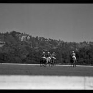 Access to this collection is generously supported by Arcadia funds. Raymond Griffith was one of the great silent movie comedians; Darryl Zanuck was an American film studio executive and producer; and Lucien Hubbard was a film producer and screenwriter. The Los Indios polo team was organized by Juan Reynal, from Argentina, in the winter of 1930-1931. Davy Whyte is recorded as the captain of the team in Los Angeles Times articles published from July through October 1931. Distant view of the Los Indios polo team, with Raymond Griffith, Darryl Zanuck, Lucian Hubbard and Dave Whyte, playing polo