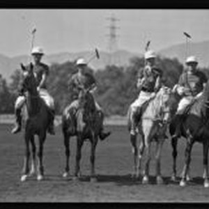 Access to this collection is generously supported by Arcadia funds. Photograph of Dave Whyte, Darryl Zanuck, Lucian Hubbard and Raymond Griffith, of the Los Indiens polo team, posing on their horses with their mallets raised. They wear t-shirts with the Indian head nickel image on the front. The Los Indios polo team was organized by Juan Reynal, from Argentina, in the winter of 1930-1931. Davy Whyte is recorded as the captain of the team in Los Angeles Times articles published from July through October 1931. Darryl Zanuck was an American film studio executive and producer; Lucien Hubbard was a film producer and screenwriter; and Raymond Griffith was one of the great silent movie comedians.