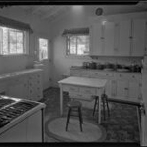Access to this collection is generously supported by Arcadia funds. William Marien Conselman was an American screenwriter who also wrote newspaper comic strips. View of the kitchen vases in the house of William Conselman with a gas range, a center work table with small braided rugs on the floor on either side, canisters lined up along one counter and a water cooler in the corner. The William Conselman Residence was located at 4905 Lockhaven Ave. Text from negative sleeve: Conselman. 5190. Printed.