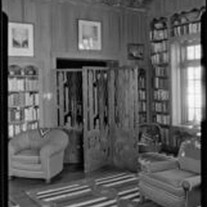 Access to this collection is generously supported by Arcadia funds. View of the living room in the house of William Conselman, with book cases built into the wood paneled walls, and furnished with upholstered chairs, a carved wood folding screen and Indian throw rugs. William Marien Conselman was an American screenwriter who also wrote newspaper comic strips. The William Conselman Residence was located at 4905 Lockhaven Ave. Text from negative sleeve: Conselman. 5190. Printed.
